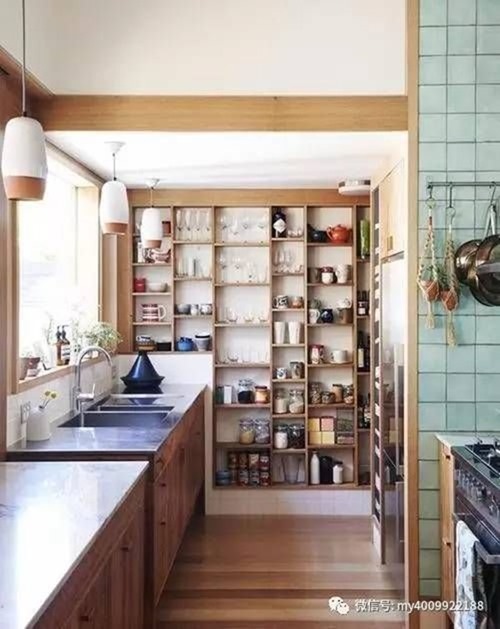 ▲廚房小也不能成為隨便的藉口,清爽的櫥櫃收納所有必需品,乾淨清爽。小物品就交給各種置物架,再放上兩盆鮮花、綠植,生活就是要享受,吃更不能隨意對待。